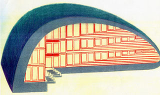An inter-active art/architecture project for the Generative Art Trust, in conjunction with sculptor Paul Neagu, based on his 'Hyphen' sculpture. The building incorporates exhibition spaces, studios with a sound-proof room, a library, archive, video projection room, cafe, conference room and offices. Commission and negotiations with local authorities in 2000-02.